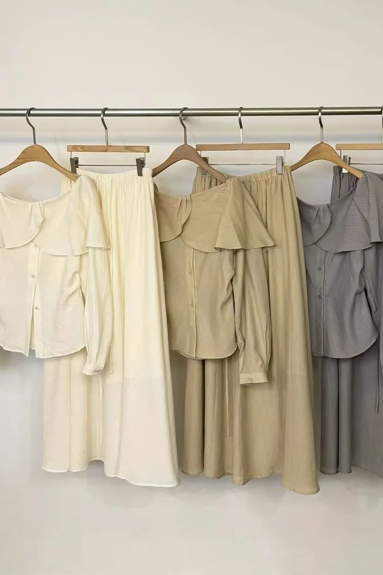 減齡荷葉排釦上衣裙set(白,杏,灰)
