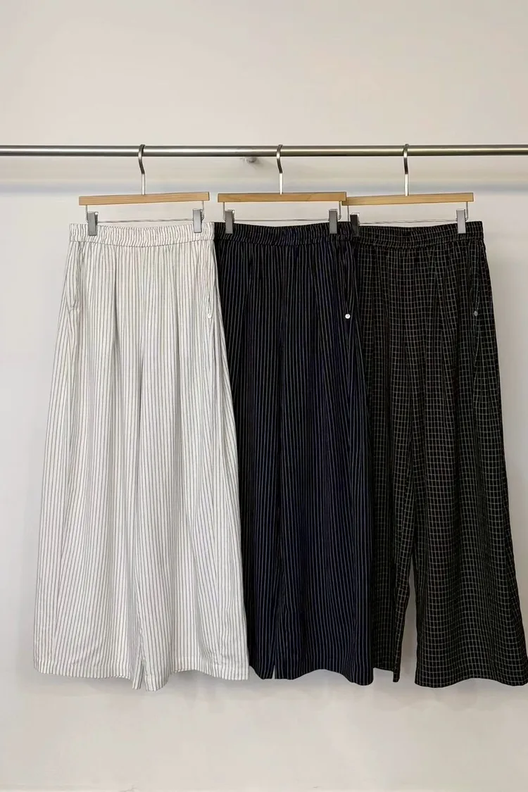 棉麻30%天絲65%休閒直條鬆緊長褲(白,黑,格紋)
