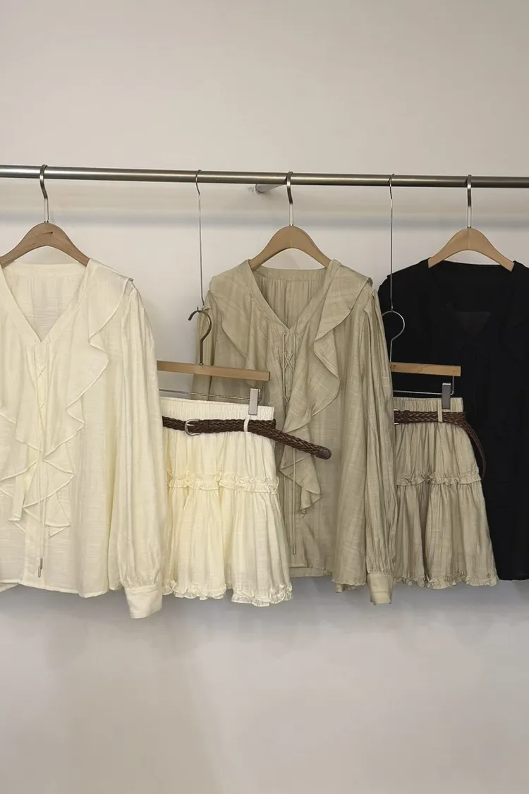 人造絲80%波浪領上衣褲裙set(米,杏,黑)