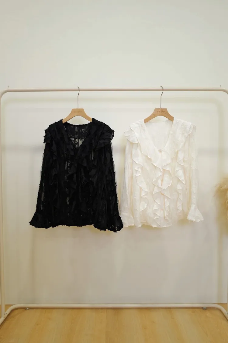 甜美荷葉刺繡上衣(白,黑)