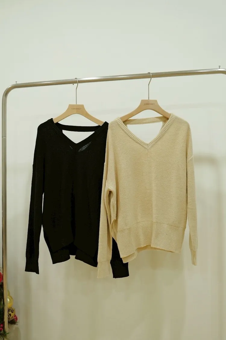 羊毛55%慵懶V領後挖空上衣(杏,黑)