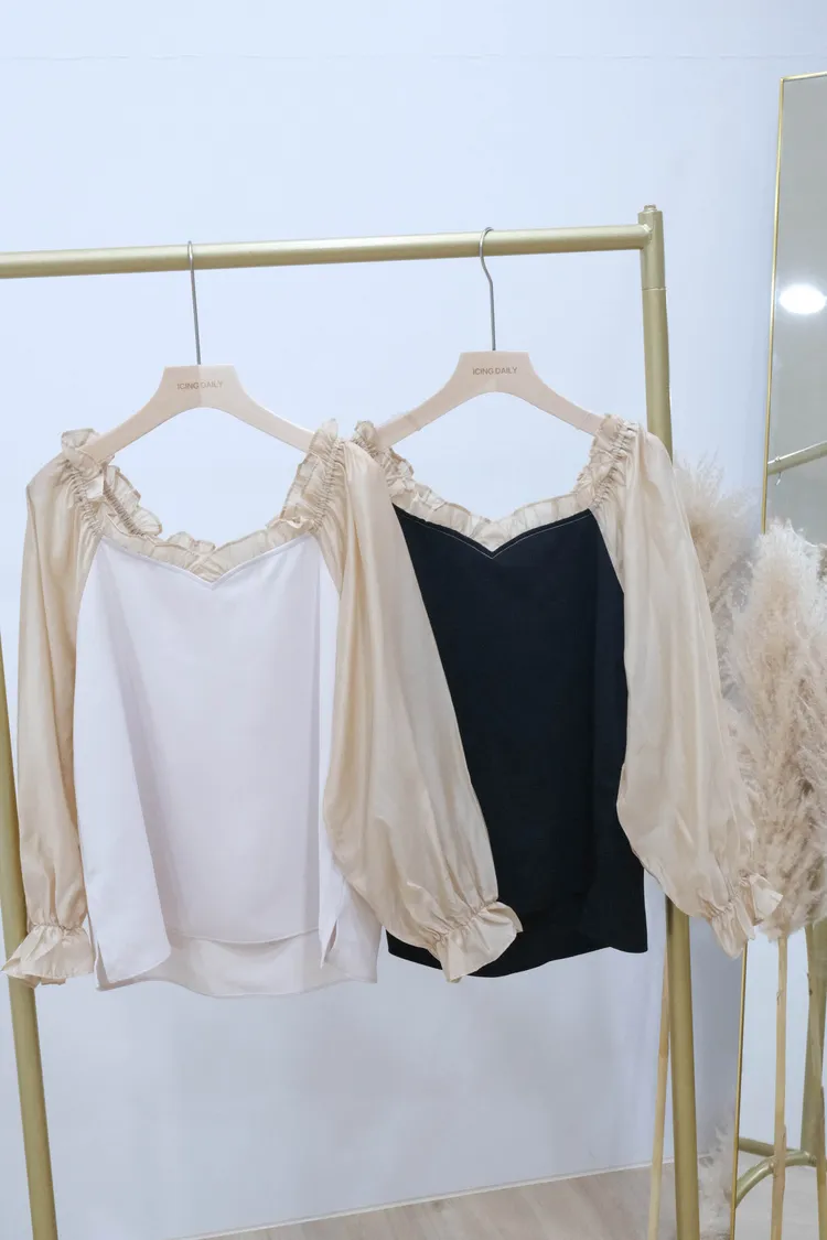 桃心領荷葉滾邊上衣(白/黑)